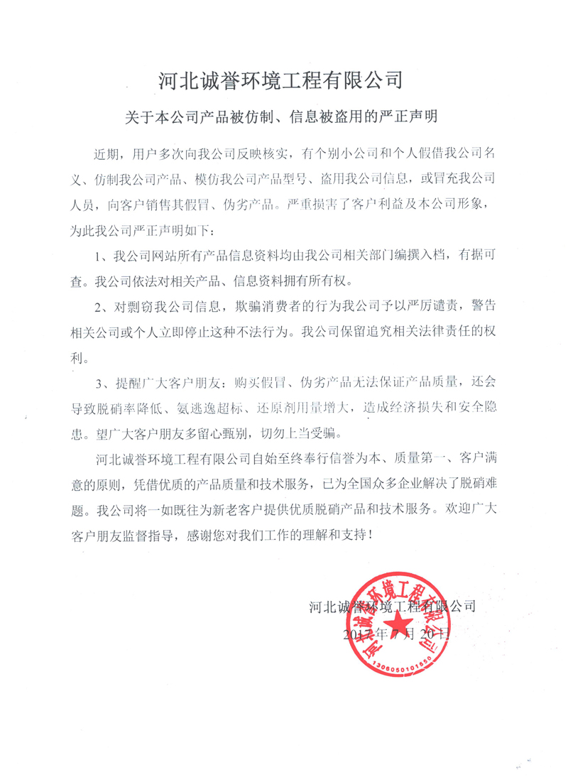 3、提醒廣大客戶朋友:購買假冒、偽劣產(chǎn)品無法保證產(chǎn)品質(zhì)量,還會導致脫硝率降低、氨逃逸超標、還原劑用量增大,造成經(jīng)濟損失和安全隱患。望廣大客戶朋友多留心甄別,切勿上當受騙。